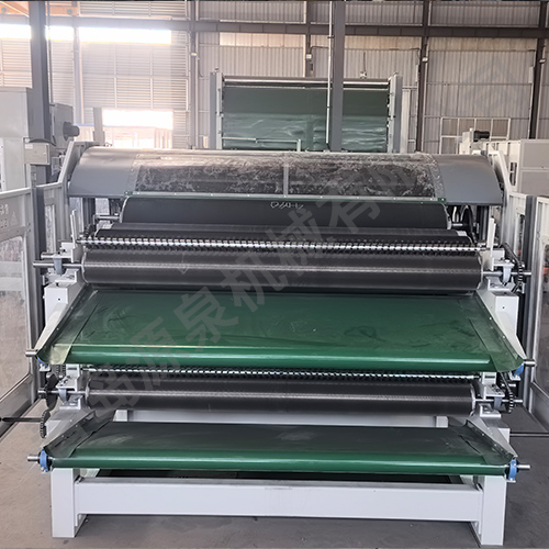 該機采用雙錫林梳理,雙道夫,雙雜亂出棉,雙羅拉剝棉,具有分梳能力強,梳理精度高等優點。喂入羅拉分上下兩組配對,變頻調速,并裝有金屬探測裝置,具有自停報警功能。且自動送入鋪網機斜簾,減輕操作工的勞動強度。